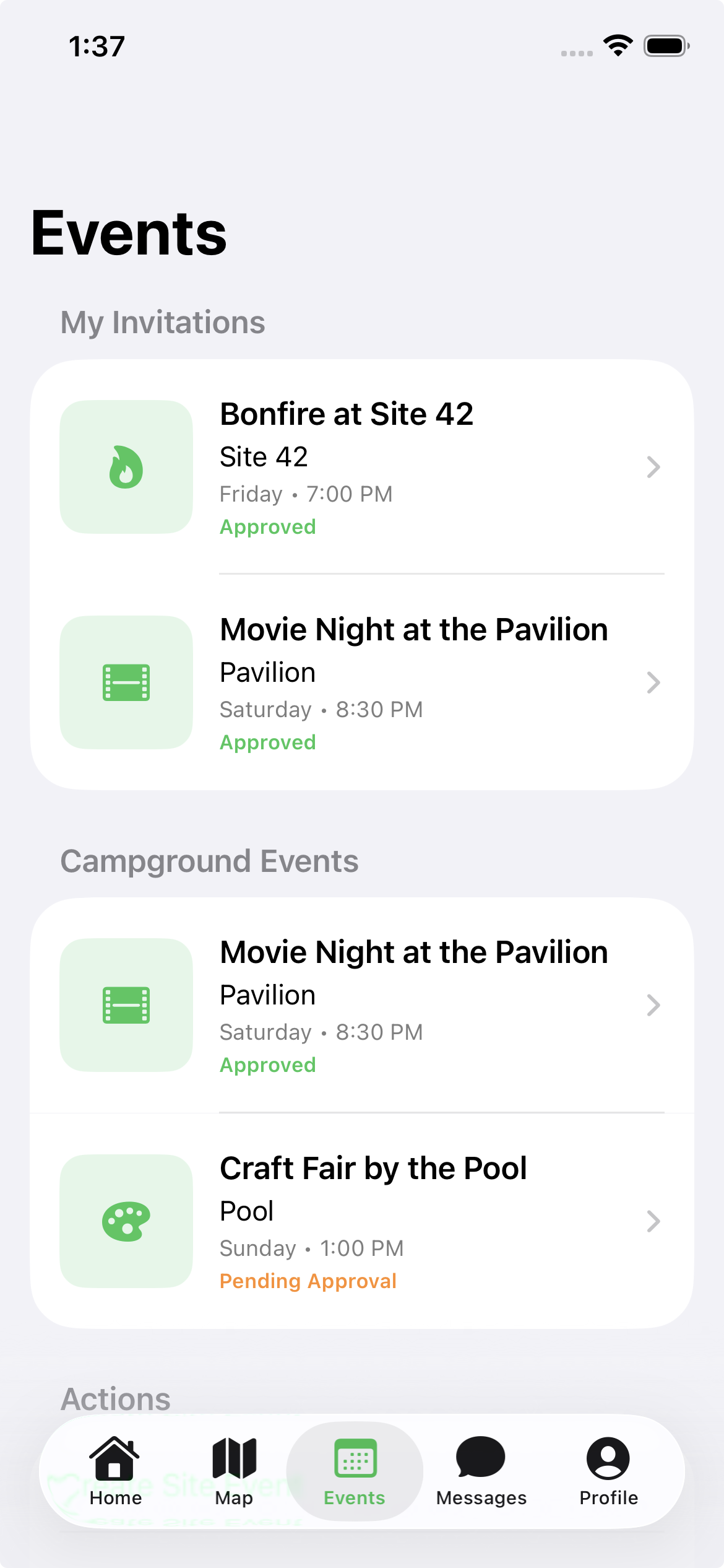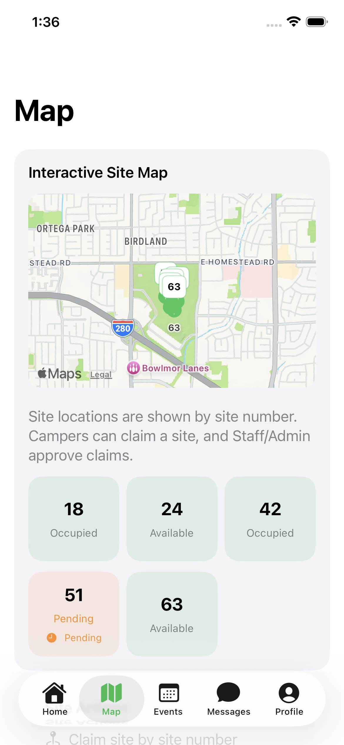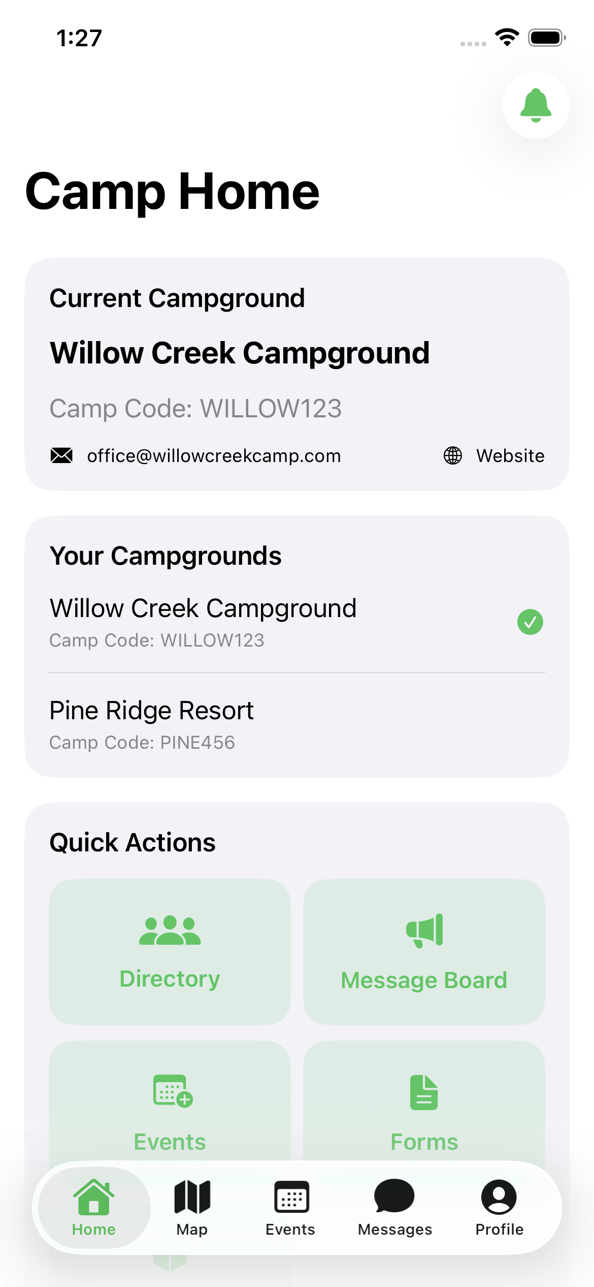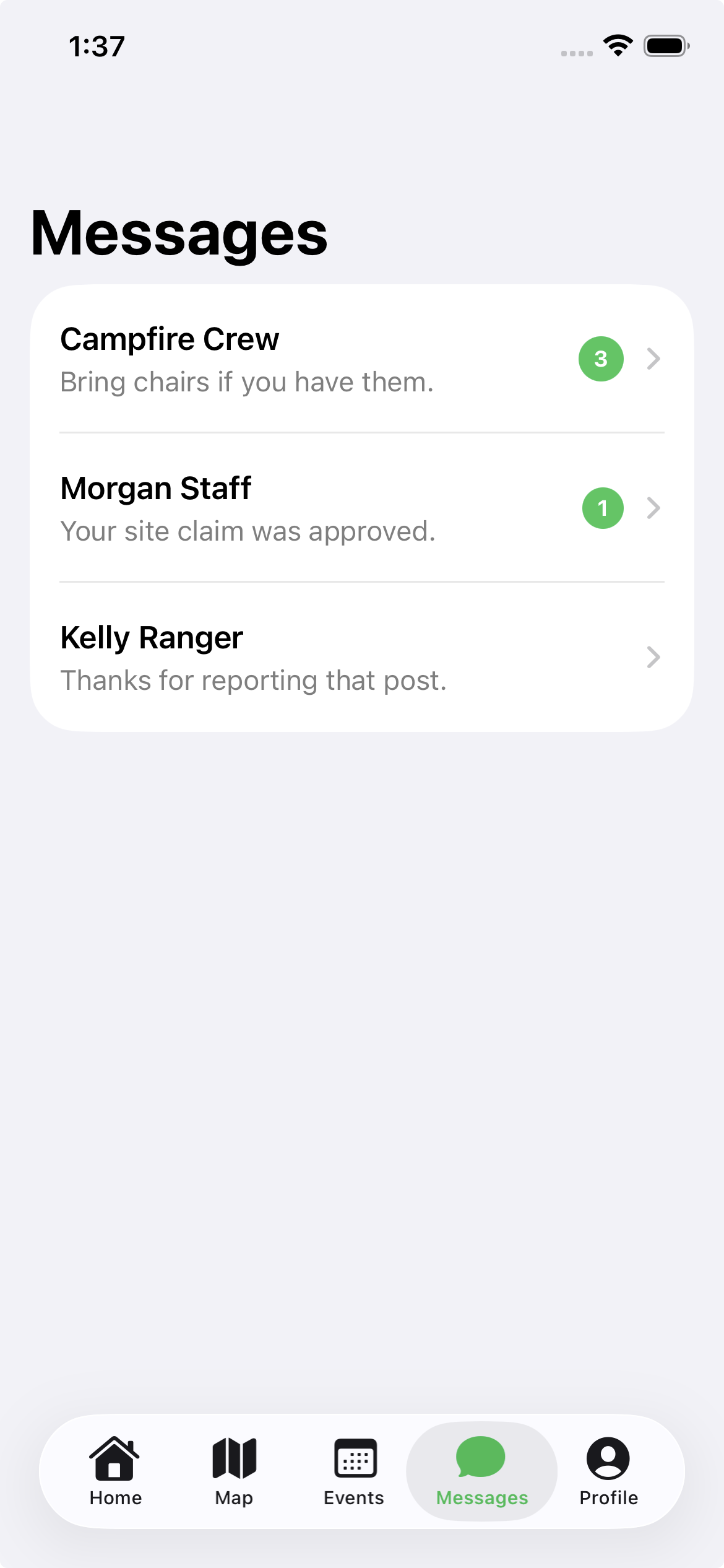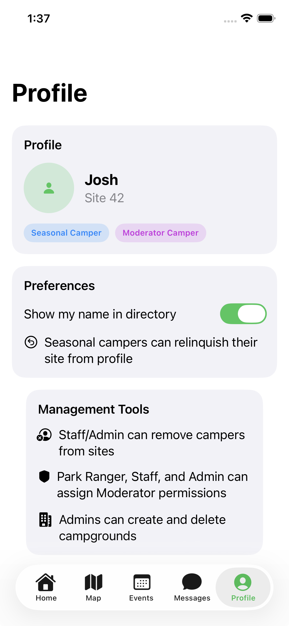 CampVibe gives your campground a polished mobile home base with announcements, an interactive map, events, messaging, and a digital member profile that feels as refined as the app itself.